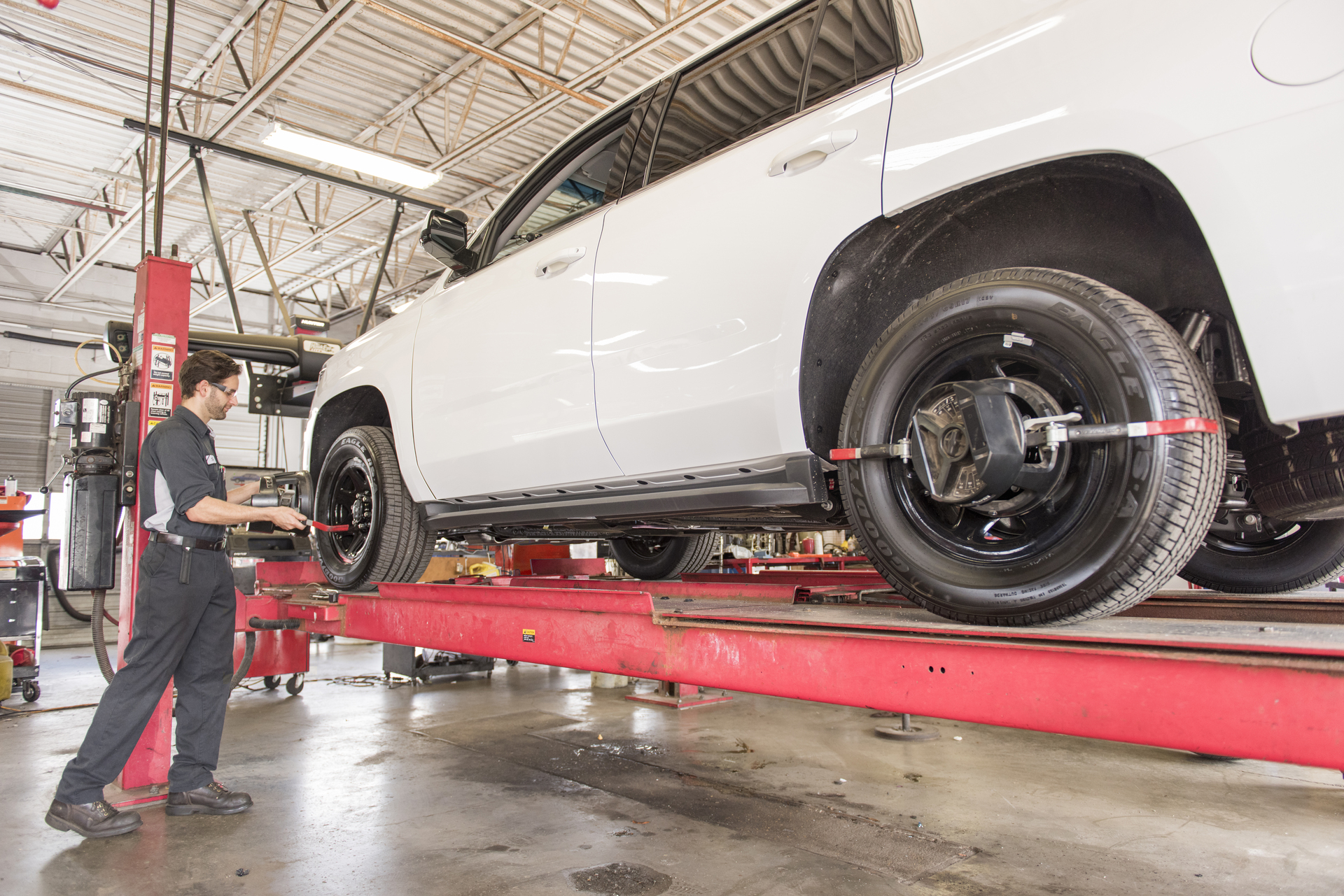 Hunter's industry-leading alignment technology on our four-post lift rack! Complete with Fully Integrated Alignment capabilities!